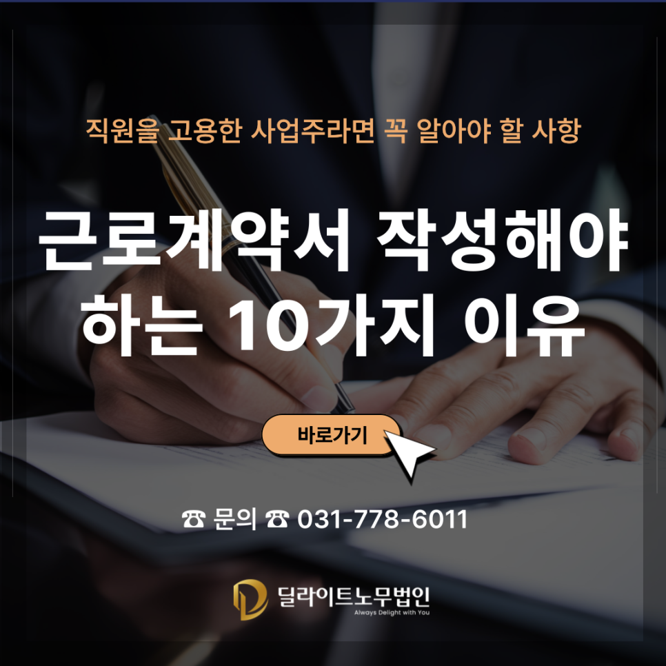 ※ 근로계약서 작성은 단순히 법을 지키는 행위 그 이상입니다. 경영 안정성 확보, 노무리스크 관리, 신뢰기반의 조직문화 형성까지 연결될 수 있는 필수요소입니다. 잘쓰여진 계약서 한장이 수백만원, 수천만원의 법적 책임을 막아줄 수 있다는 점 꼭 기억하시길 바라며, 계약서 정비 등 노무컨설팅 관련 문의는 언제든지 저희 딜라이트노무법인으로 연락주시기 바랍니다. 감사합니다.