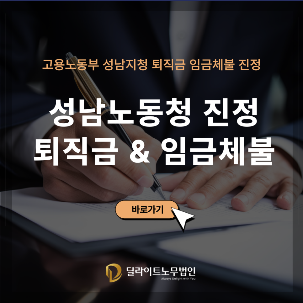 ※ 성남노동청 퇴직금, 임금체불 문제로 고민중이시라면 혼자서 끙끙 앓기 보다, 전문가의 상담을 먼저 받아보신 후 빠르게 해결하는 것이 좋습니다. 관련하여 상담, 사건 의뢰 등 도움이 필요하신 경우 언제든지 저희 딜라이트노무법인으로 연락주시기 바랍니다. 감사합니다.