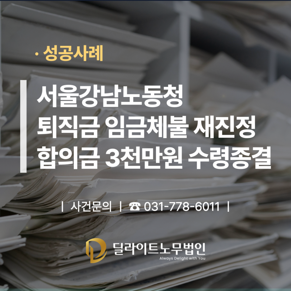 · [성공사례] 임금체불 퇴직금 재진정 사건 회사와 합의로 3,000만원 수령 종결 (#서울강남지청 #노동청사건 #노무사선임)