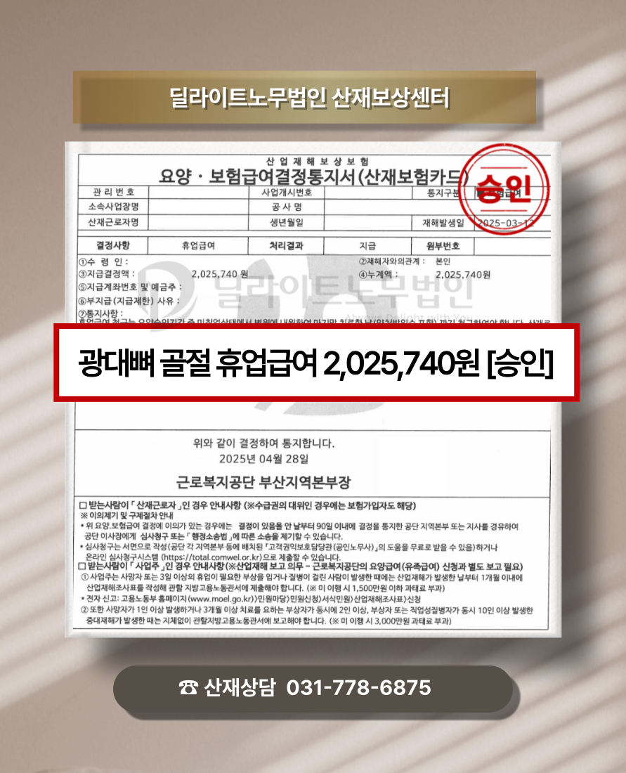 이번 사례에서는 총 2개월 반가량의 요양기간이 승인되었으며, 재해자분께서는 휴업급여 2,025,740원을 지급받으셨습니다. 다만, 산재 승인까지 일정한 기간이 소요되면서 우선 일부 금액만 지급되었고, 추후 나머지 휴업급여에 대해서도 추가 청구를 진행할 예정입니다.